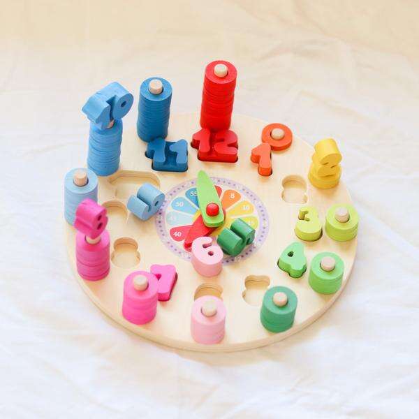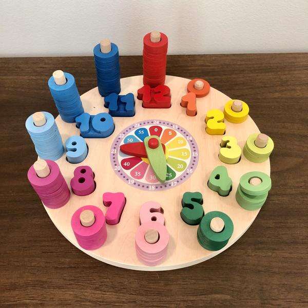 O brinquedo divertido ensina as crianças a ver as horas olhando o relógio! Brinquedo ideal para exercitar as crianças na distinção de formas, números e cores. Material: Madeira