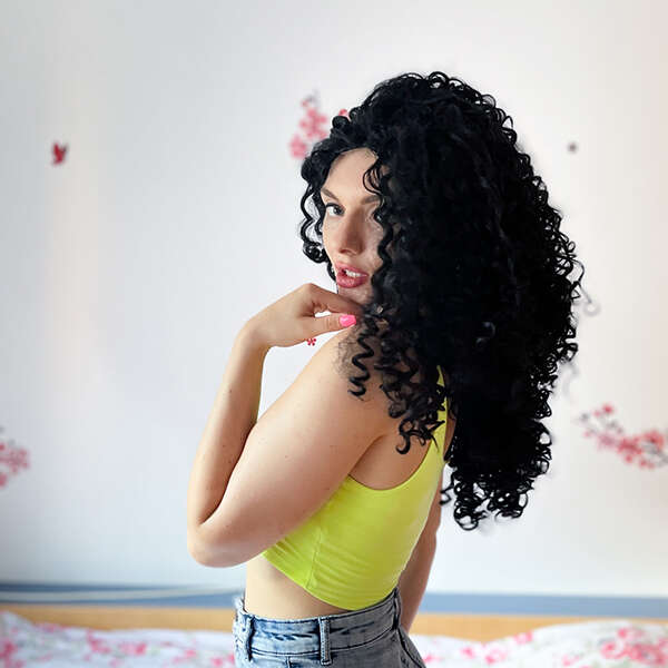 Cachos longos e magníficos não são mais um sonho graças a uma peruca atraente com cachos distintos e transparentes.