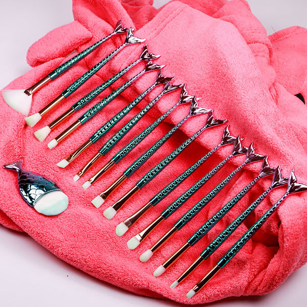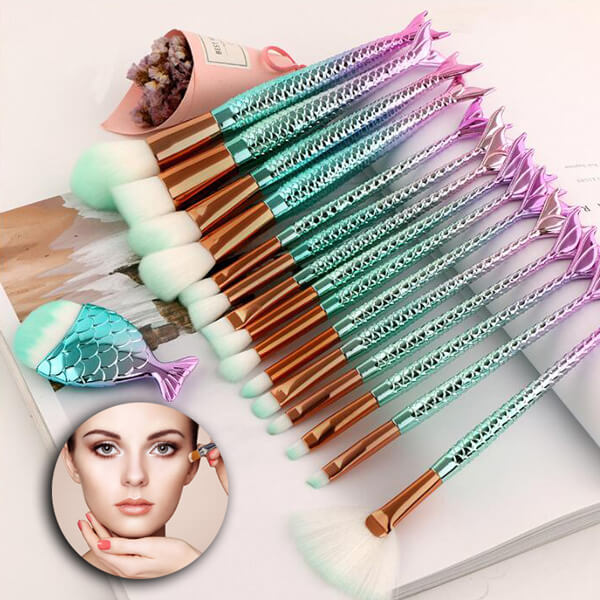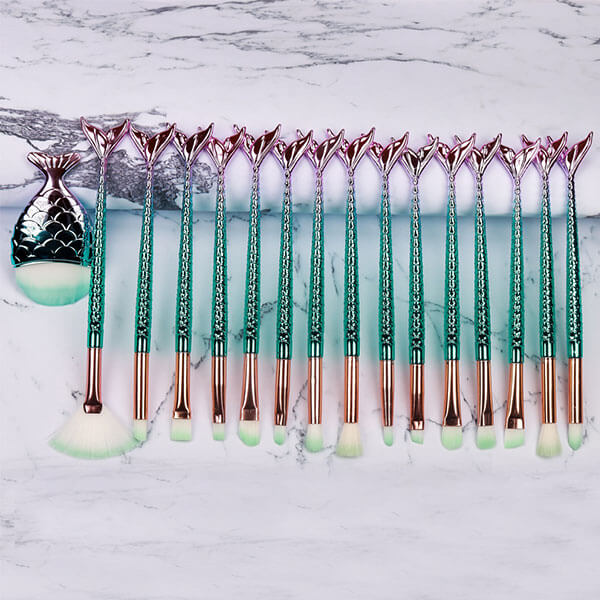 Um incrível conjunto de pincéis de maquilhagem exclusivos, com roupas chiques de uma cauda de sereia colorida. Macio, hipoalergênico e gentil.