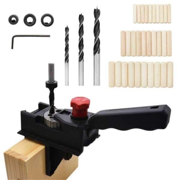 Ferramenta guia de broca para madeira, grampos, 3 tamanhos de cunha de madeira, broca e régua.
